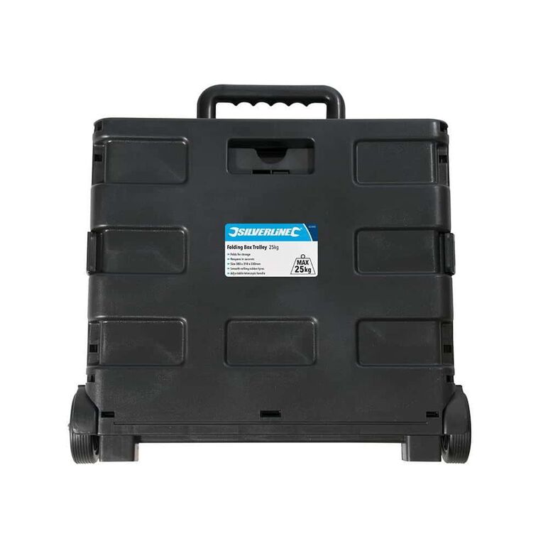 Leichter Kastenkarren, komplett einklappbar zur Aufbewahrung oder zum Transport. Lässt sich in Sekunden aufbauen. Passt in den Kofferraum. Leichtgängige Gummireifen und einstellbarer Teleskopgriff. Abmessungen (L x H x B): 360 x 300 x 380 mm.