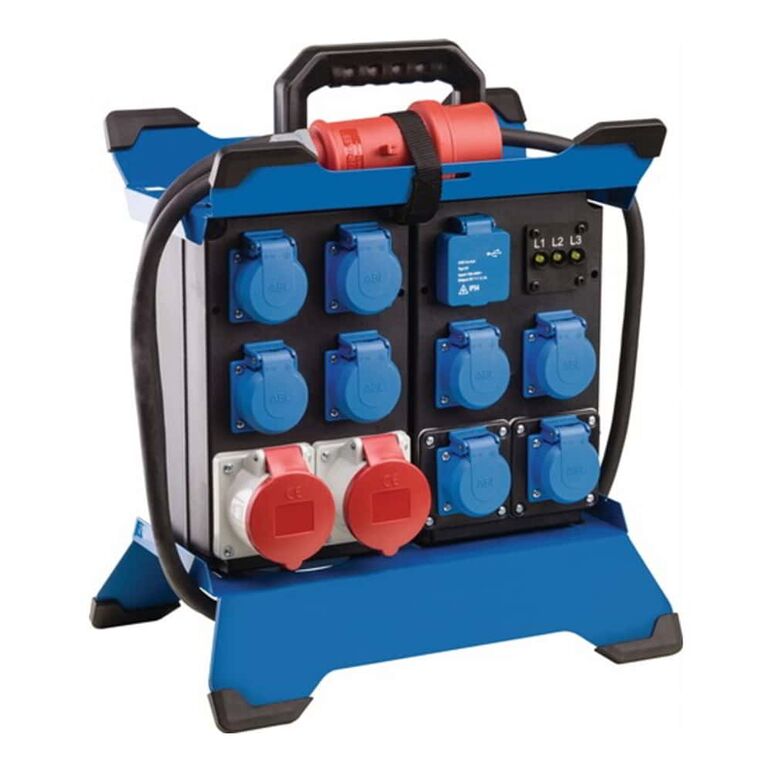 robustes Gehäuse aus hochbruchfestem Spezialkunststoff · stabiles Metallgestell mit Kantensschutz · mit großem, ergonomischem Tragegriff und Kabelaufwickler · Abmessungen (BxHxT): 400x450x252 mm · geprüft nach DIN VDE 0620-1, IEC 60309, EN 61439-4, DIN EN 50525-2 · fremdkörper und spritzwassergeschützt, zur dauerhaften Verwendung im Außenbereich geeignet · IP44 Weitere technische Eigenschaften: · Absicherung: 1x FI 40 A, 30 mA, TypA · prüfpflichtig: ja