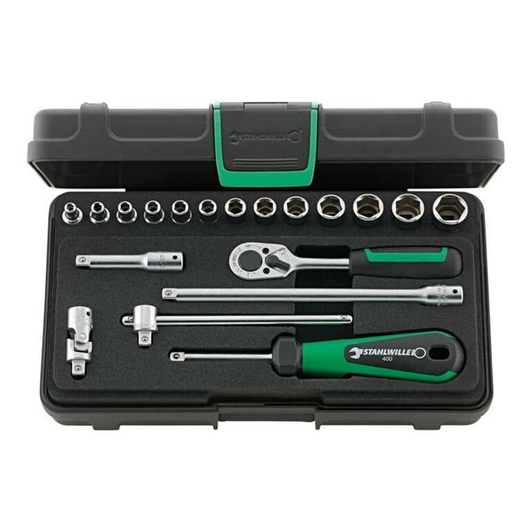 STAHLWILLE 40/13/6, 1/4" Steckschlüsselsatz 19-tlg., Knarre, Verlängerungen, Stecknüsse, Steckgriff etc. im robusten ABS-Kunststoffkasten, Made in Germany