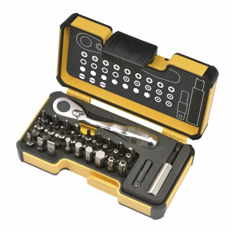 Felo - XS 33 - Werkzeugsatz 1/4" mit Miniratsche, Bits und Zubehör in XS-Strongbox, 33-tlg.
