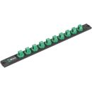 1 Nuss-Magnetleiste, unbestückt. Für bis zu 10 Steckschlüsseleinsätze und/oder Bitnüsse mit 1/2"-Antrieb. Die Magnetleiste ermöglicht die temporäre Anbringung an metallischen Oberflächen und verfügt dank der Twist to unlock Funktion über eine sichere Nussverriegelung und -entriegelung.