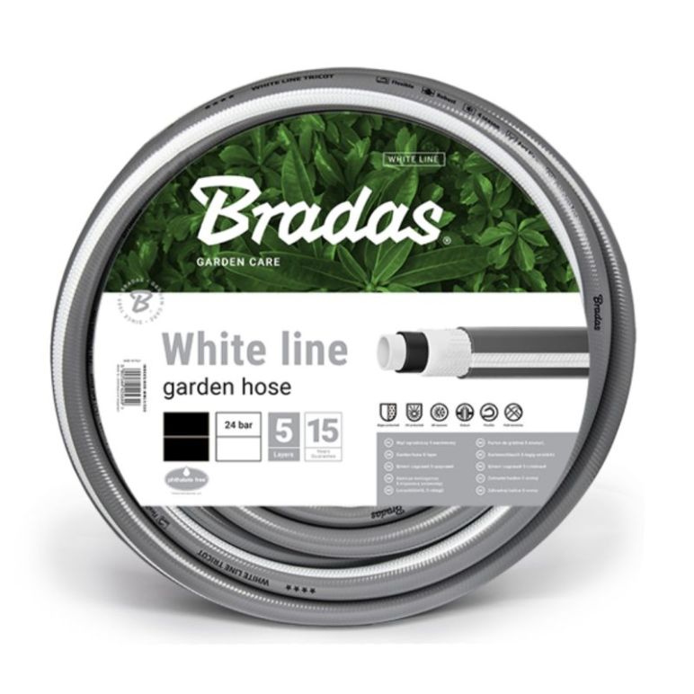 professioneller WHITE LINE-Gartenschlauch, schadstofffrei, TOP QUALITÄT professioneller Gartenschlauch 3/4 Zoll (Ø 19mm), grau/weiß, 5-schichtig, ohne Schadstoffe UV-beständig (keine Algenbildung) flexibel auch bei niedrigen Temperaturen Betriebstemperatur: -20°C bis +60°C druckbeständig bis 24 Bar lieferbar in 30 und 50 Meter Schlauchaufbau innere Schicht aus weißem PVC, lebensmittelecht  schwarzes PVC gegen Algenbildung flexibles, weißes, geschäumtes PVC ( für leichteres Auf- u. Abrollen auf dem Schlauchwagen) Tricot-Verstärkung (spezielles hochreißfestes Polyester-Garn) äußere wetterresistente Schicht aus flexiblen PVC (grau mit weißen Streifen) Hinweis: Die Abbildung des Schlauches ist ein Universalfoto. Die technischen Angaben (Zoll- u. Meterangabe) finden Sie in der Produktbeschreibung. Das Aussehen des Schlauches ist dem Foto entsprechend.