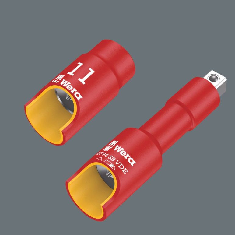 3/8" VDE-Nüsse mit erhöhter Sicherheit durch gelben Isolationskern, welcher bei einer eventuellen Beschädigung der äußeren roten VDE Isolationsschicht sichtbar wird. Stückgeprüftes Werkzeug gem. IEC 60900 bei 10.000 V für sicheres Arbeiten bei der zugelassenen Spannung von 1.000 V.
