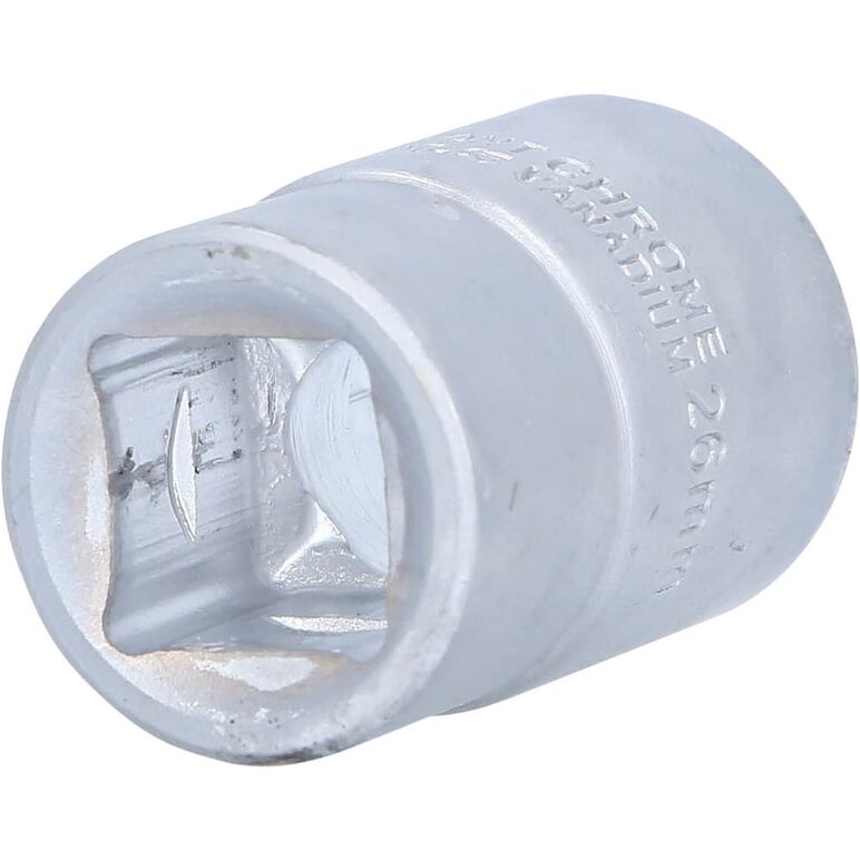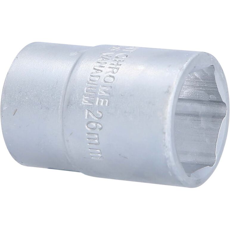 Die BRILLIANT TOOLS Sechskant-Stecknuss BT025926 ist nach DIN 3124 gefertigt. Der kurze metrische Einsatz hat einen 3/4" (20 mm) Innenvierkant-Antrieb, welcher nach DIN 3120 gefertigt wurde. Die Schlüsselweite des Sechskants ist 26 mm. Die Stecknuss hat eine Gesamtlänge von 50 mm. Die Oberfläche ist matt verchromt.