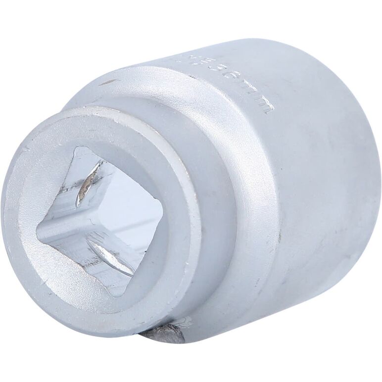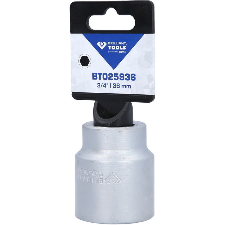 Die BRILLIANT TOOLS Sechskant-Stecknuss BT025936 ist nach DIN 3124 gefertigt. Der kurze metrische Einsatz hat einen 3/4" (20 mm) Innenvierkant-Antrieb, welcher nach DIN 3120 gefertigt wurde. Die Schlüsselweite des Sechskants ist 36 mm. Die Stecknuss hat eine Gesamtlänge von 55 mm. Die Oberfläche ist matt verchromt.