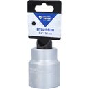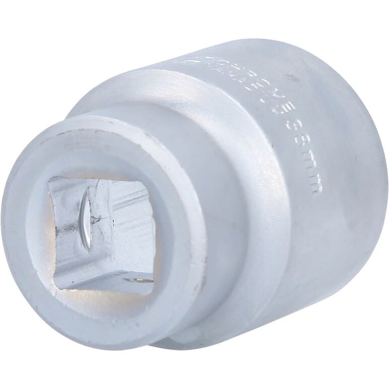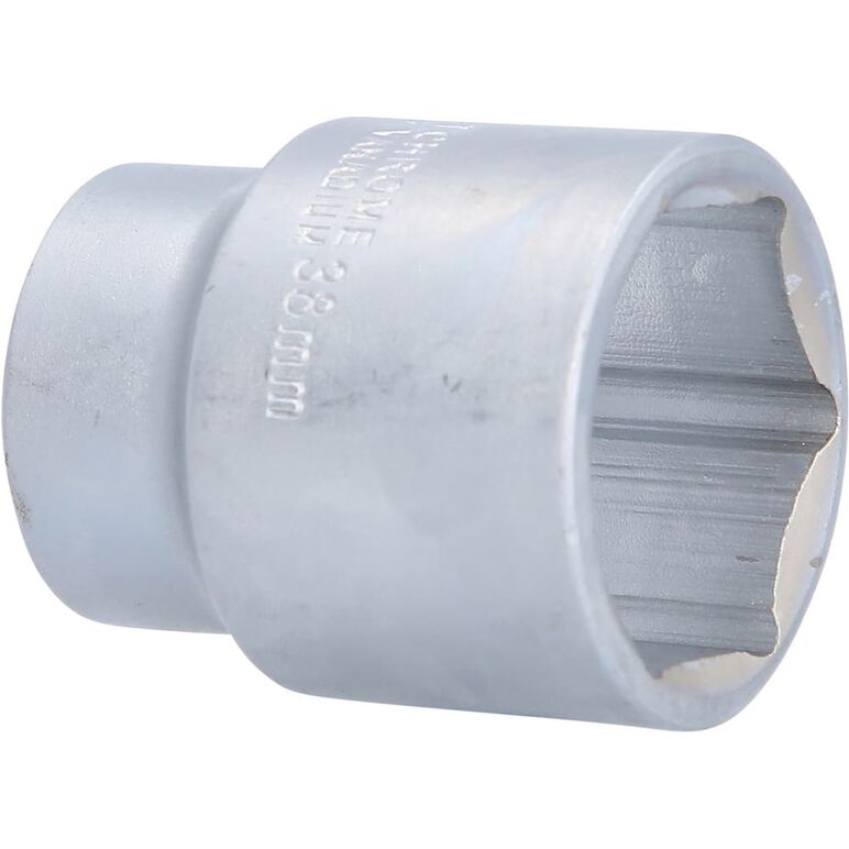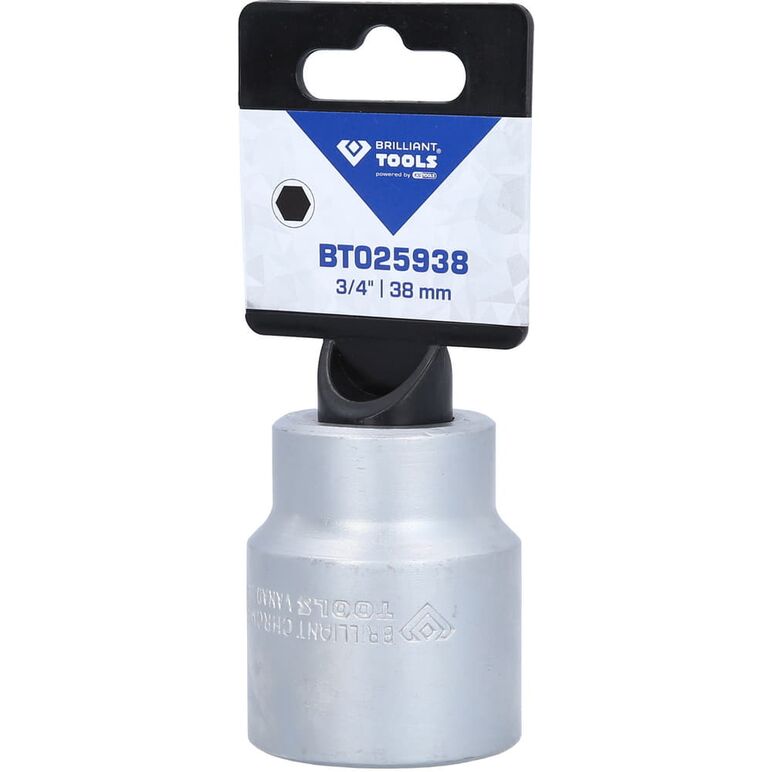 Die BRILLIANT TOOLS Sechskant-Stecknuss BT025938 ist nach DIN 3124 gefertigt. Der kurze metrische Einsatz hat einen 3/4" (20 mm) Innenvierkant-Antrieb, welcher nach DIN 3120 gefertigt wurde. Die Schlüsselweite des Sechskants ist 38 mm. Die Stecknuss hat eine Gesamtlänge von 56 mm. Die Oberfläche ist matt verchromt.