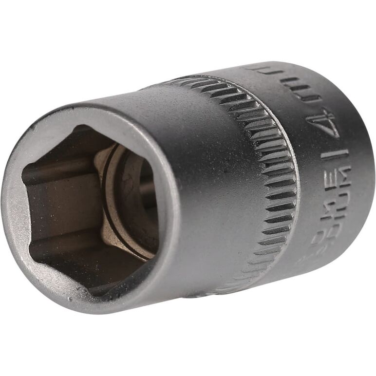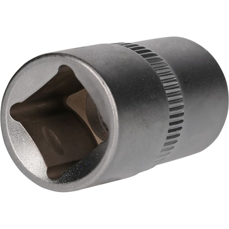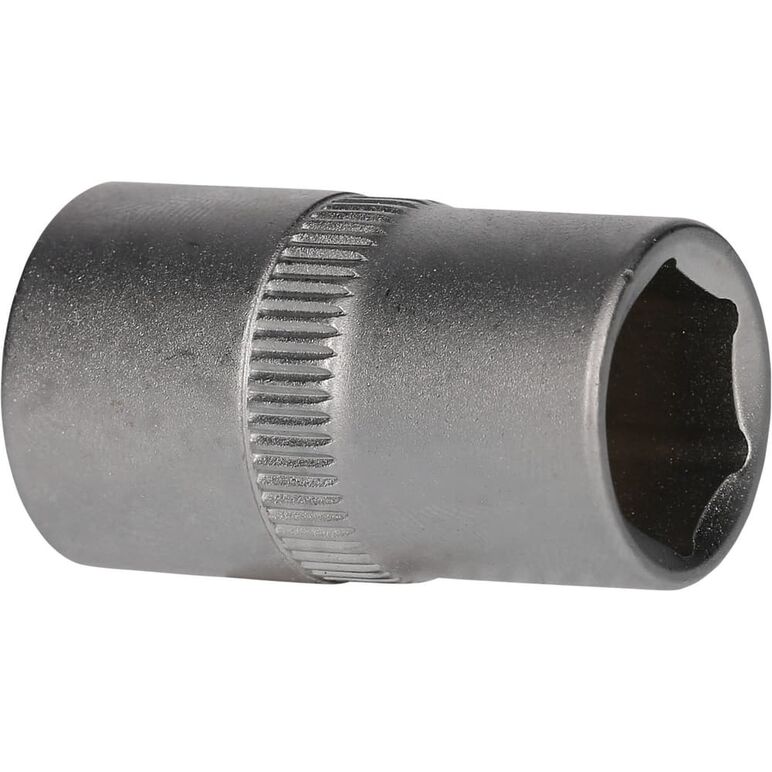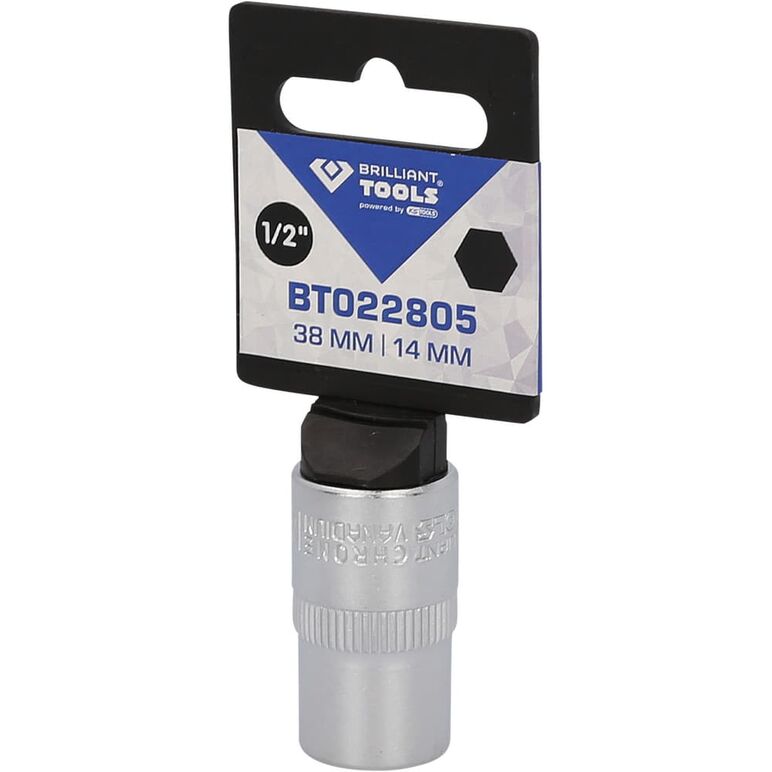 Die BRILLIANT TOOLS Sechskant-Stecknuss BT022805 ist nach DIN 3124 gefertigt. Der kurze metrische Einsatz hat einen 1/2" (12,5 mm) Innenvierkant-Antrieb welcher nach DIN 3120 gefertigt wurde. Die Schlüsselweite des Sechskants ist 14 mm. Die Stecknuss hat eine Gesamtlänge von 38 mm. Die Oberfläche ist an der Antriebsseite und an der Innensechskantseite matt verchromt, diese ist durch eine Längsrändelung getrennt.