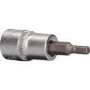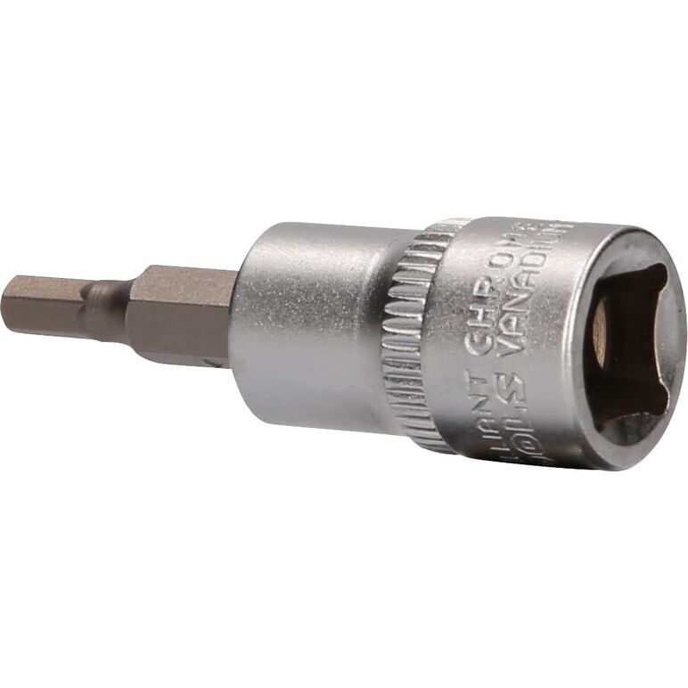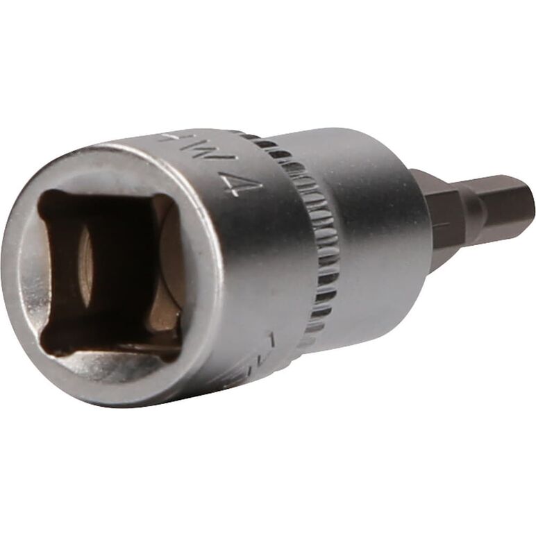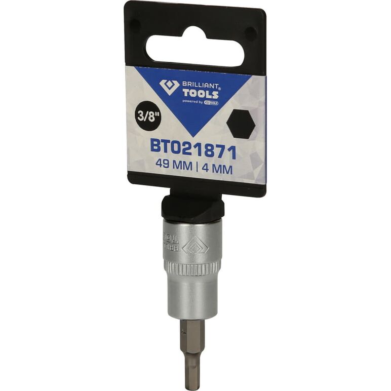 Die BRILLIANT TOOLS Innensechskant-Bit-Stecknuss BT021871 hat einen 3/8" (10 mm) Innenvierkant-Antrieb, der nach DIN 3120 gefertigt ist. Der eingepresste phosphatierte Bit hat die Größe 4. Die Bit-Stecknuss hat eine Gesamtlänge von 49 mm, die Klingenlänge beträgt 17 mm. Die Oberfläche ist an der Antriebsseite und an der Bitseite matt verchromt, diese ist durch eine Längsrändelung getrennt.