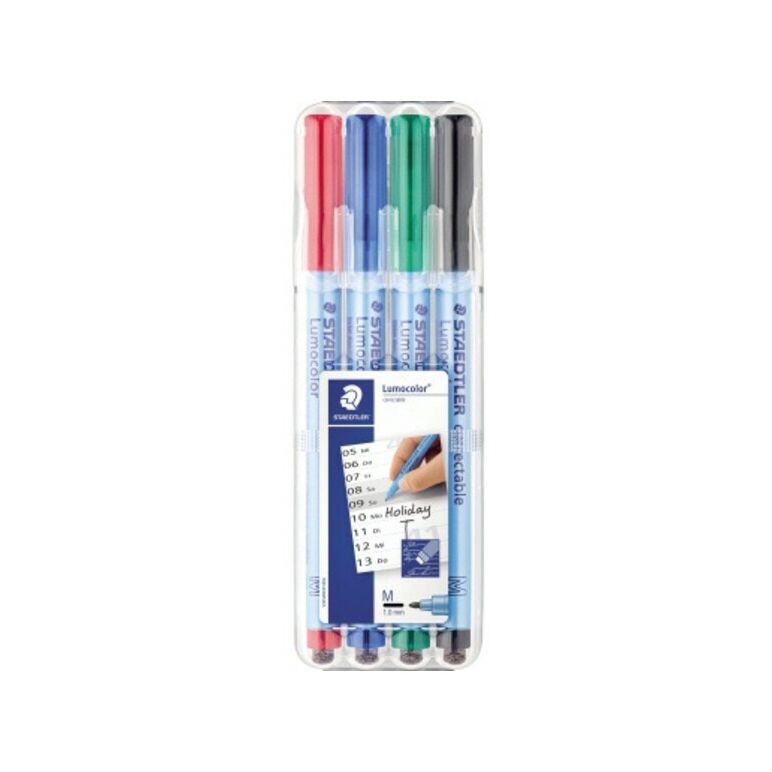 Der neue Lumocolor correctable® ist nur auf glatten Oberflächen abwischbar und ideal für alle in Schule und Ausbildung verwendeten Folien, wie Schreibfolien, Sichthüllen, Laminate und Schülertafeln. Mit Hilfe des Wischers lassen sich Fehler jederzeit trocken und sauber korrigieren. Kappe mit Abrollsicherung.
