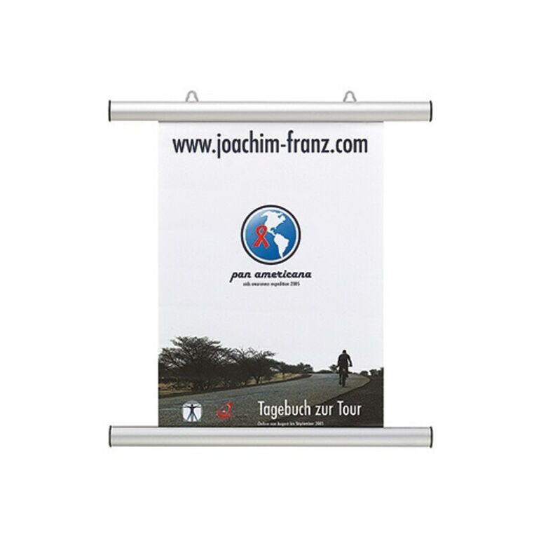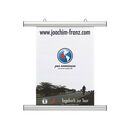 Von der Decke abgehangen, ermöglichen die Klemmleisten einen beidseitigen Aushang. Die Länge ist individuell einstellbar, je nach Aushang, da der Inhalt nur von oben und unten gehalten wird.