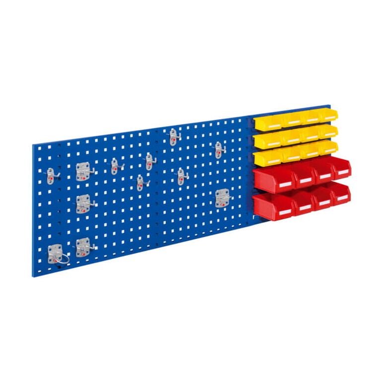• 3 x Kombiplatte H 450 x B 1500 mm, 8 x Lagersichtkästen Größe 7, 12 x Lagersichtkästen Größe 8, 1 x Werkzeughaltersortiment 12-teilig