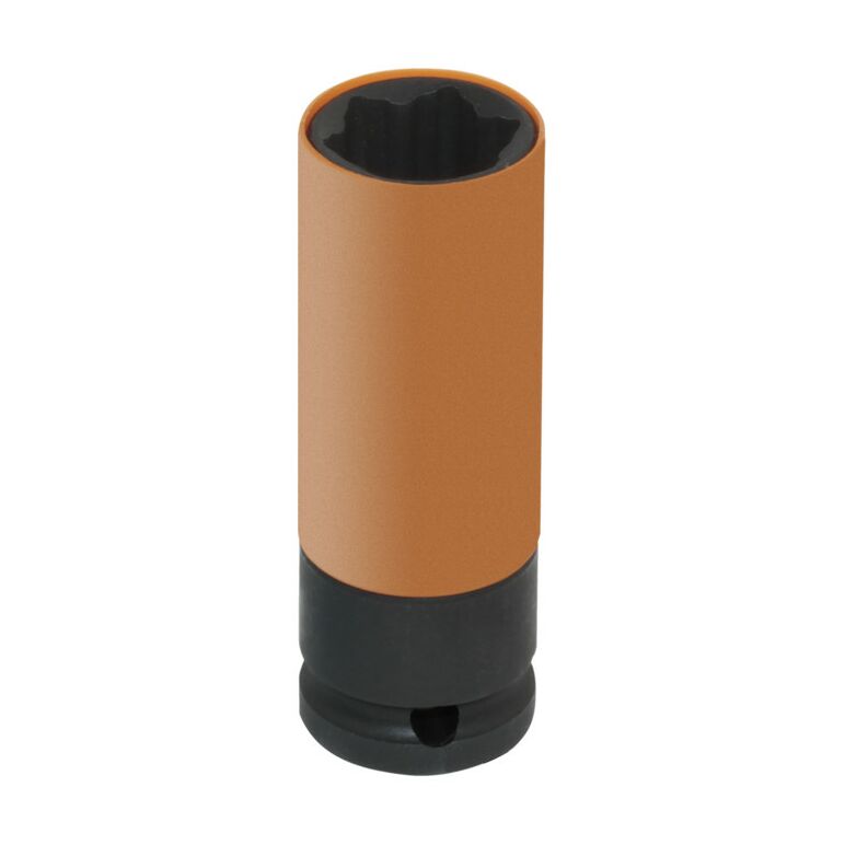 • Die Schlagnuss ist aus Chrom-Molybdän mit einer Kunststoffummantelung in der Farbe orange