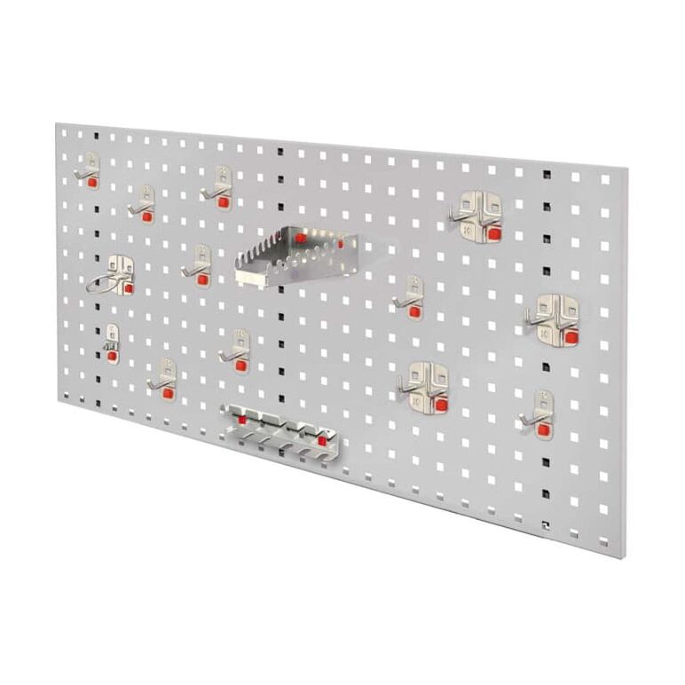 • Bestehend aus 1 Lochplatte 1000 mm, 1 ABAX Werkzeughaltersortiment 15-teilig, ®RasterPlan Werkzeughalter mit der ABAX®-Verbindung sind eine innovative und voll kompatible Erweiterung der bekannten ®RasterPlan Werkzeughalter