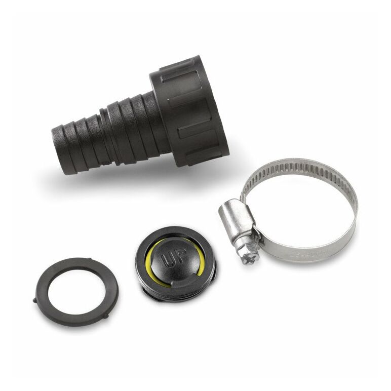 • Inklusive Überwurfmutter, Schlauchklemme, Flachdichtung und Rückschlagventil