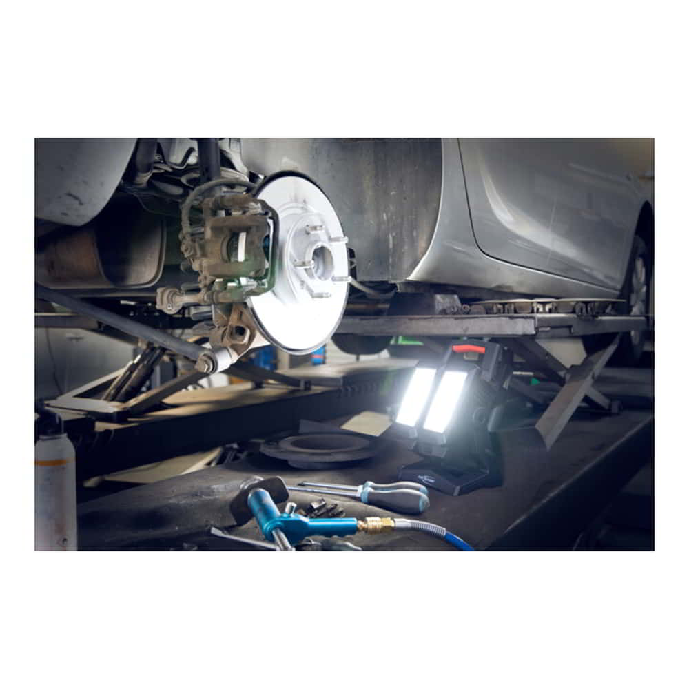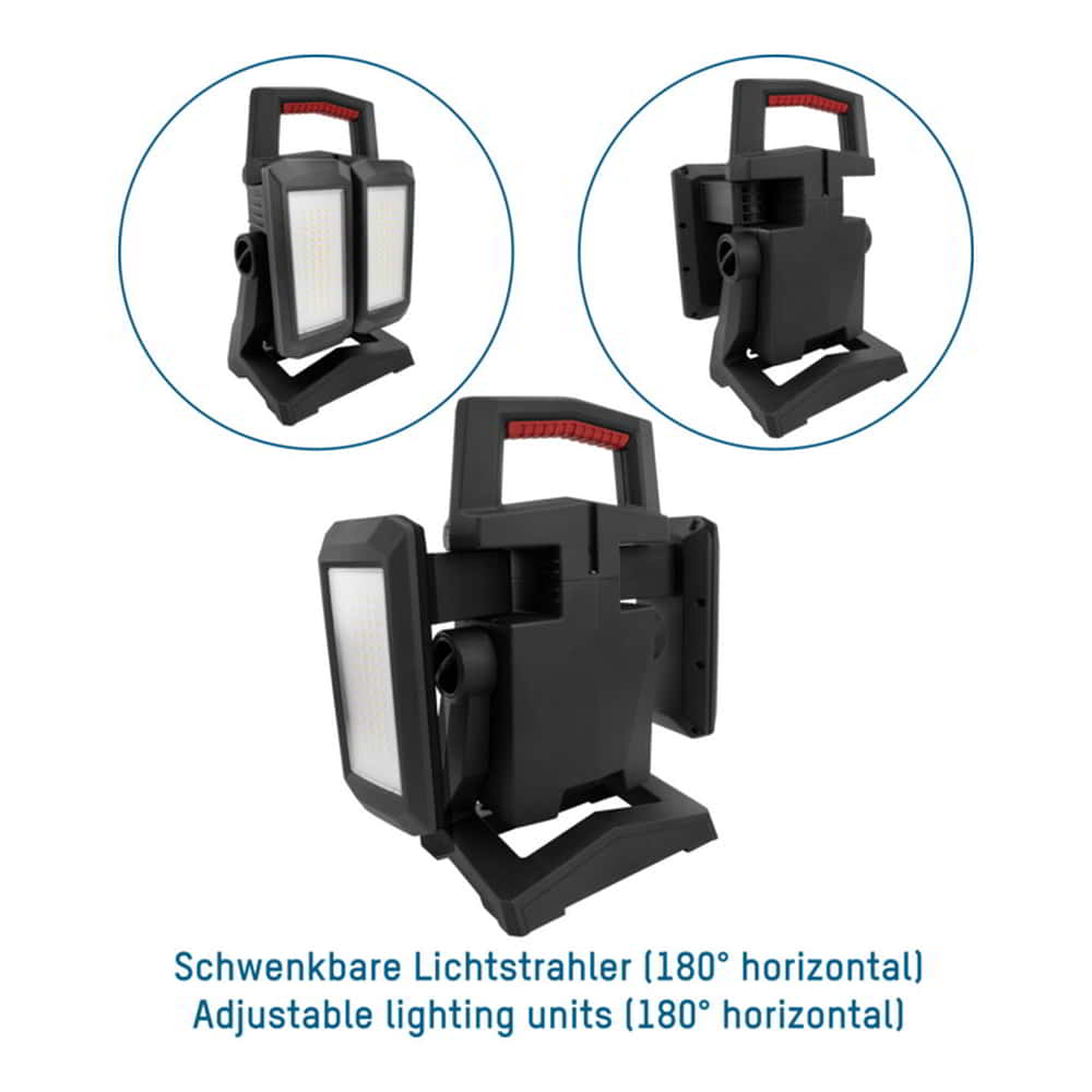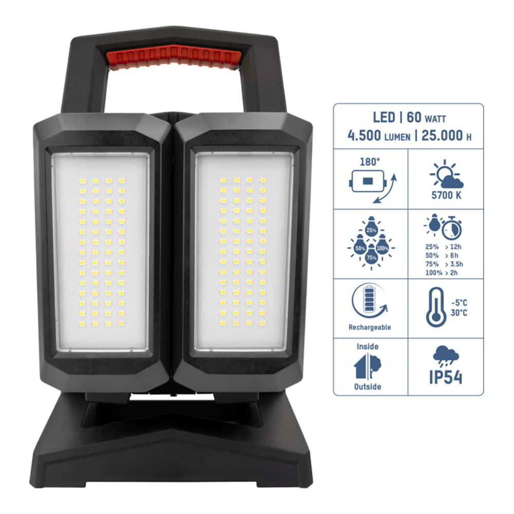 LED-Profi-Handscheinwerfer mit integriertem Akku, verschiedenen Leuchtfunktionen, Wandhalterung und orangener Farbfilterscheibe