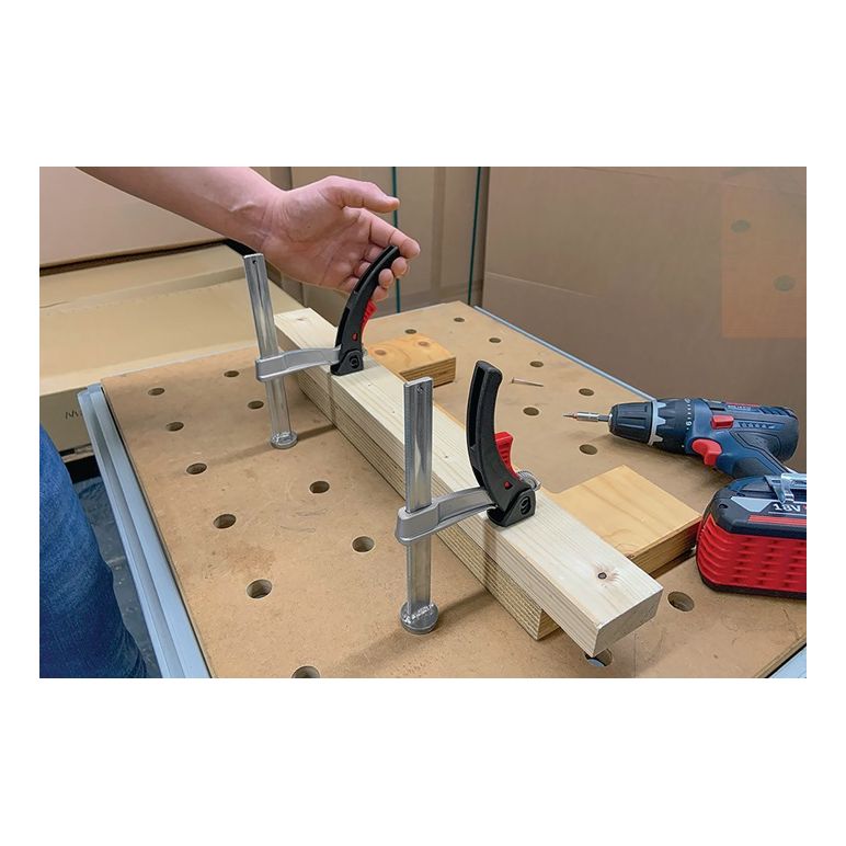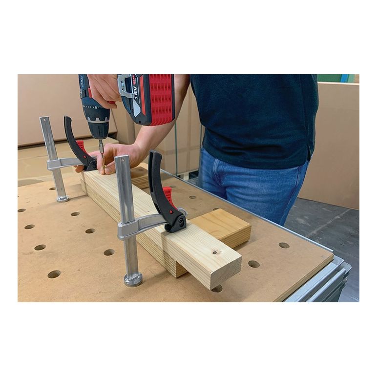 für Multifunktionstisch TW-KLI · Spannkraft bis zu 500 N · Einsatz auf Multifunktionstischen mit 20er Lochsystem · stabiler Gleitbügel aus leichtem Magnesium zum schnellen und vibrationssicheren Spannen · Profil aus kaltgezogenem Qualitätsstahl für federndes und elastisches Spannen