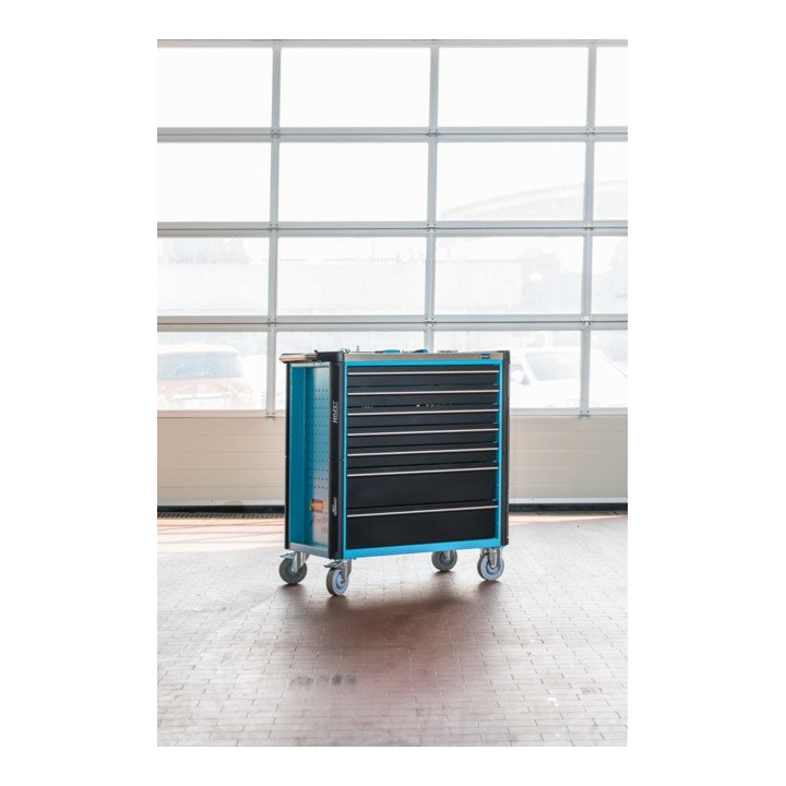 PRAKTISCH: In sieben Schubladen kann Ihr Werkzeug übersichtlich aufbewahrt werden. Zusätzlich verfügt der Wagen über eine Arbeitsplatte aus PP-Kunststoff und Seitenwände mit Euro-Vierkantlochung.