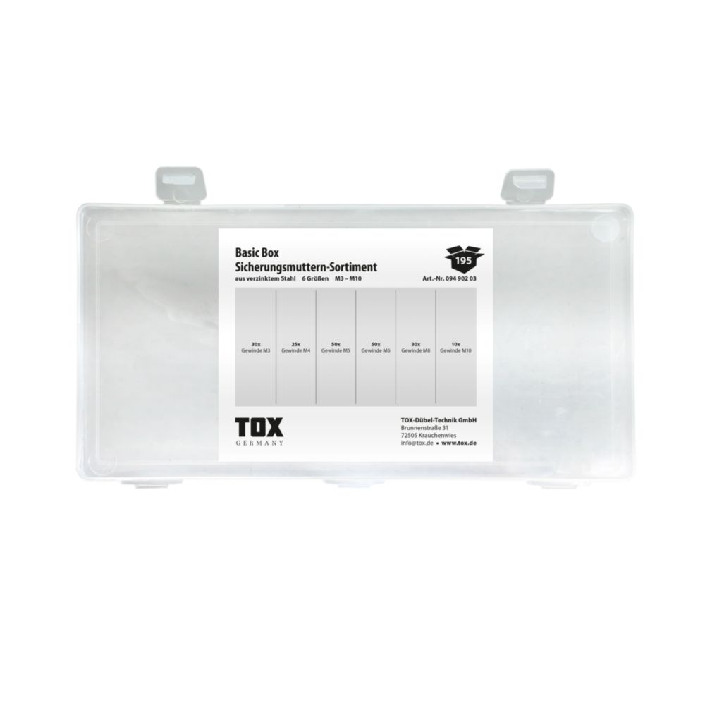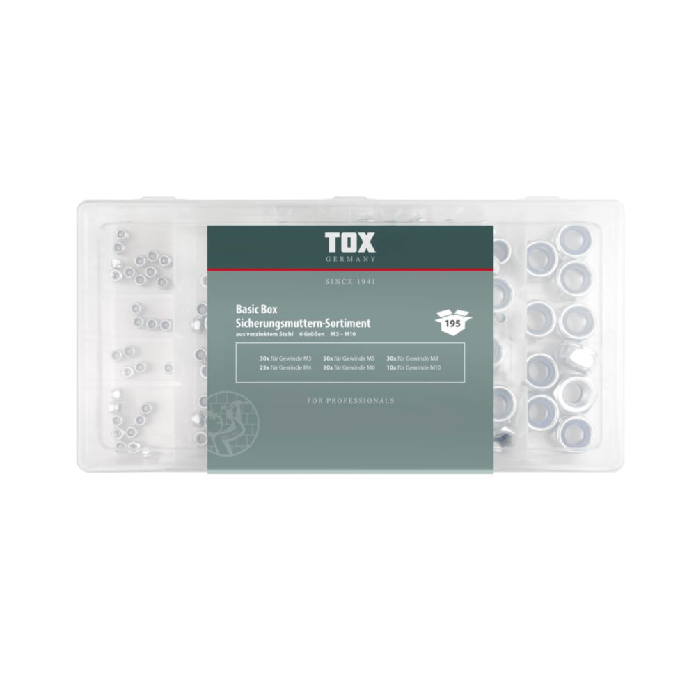 TOX Sicherungsmuttern-Sortiment aus verzinktem Stahl, Sechskantmuttern mit Polyamidklemmteil in 6 gängigen Größen in transparenter Transportbox, M3, M4, M5, M6, M8, M10, 195-tlg., 09490203