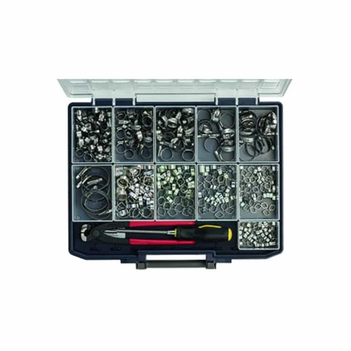 Sortimentsbox Schlauchschellen, 95 Schlauchschellen Chromstahl in Schneckengewindeausf., 250 2-Ohr-Schlauchklemmen Stahl-verzinkt. Handliche, robuste und qualitativ hochwertige Kunststoff-Sortimentsbox mit den gängigsten Schlauchklemmen (Schneckengewinde- und 2-Ohr-Ausführung).