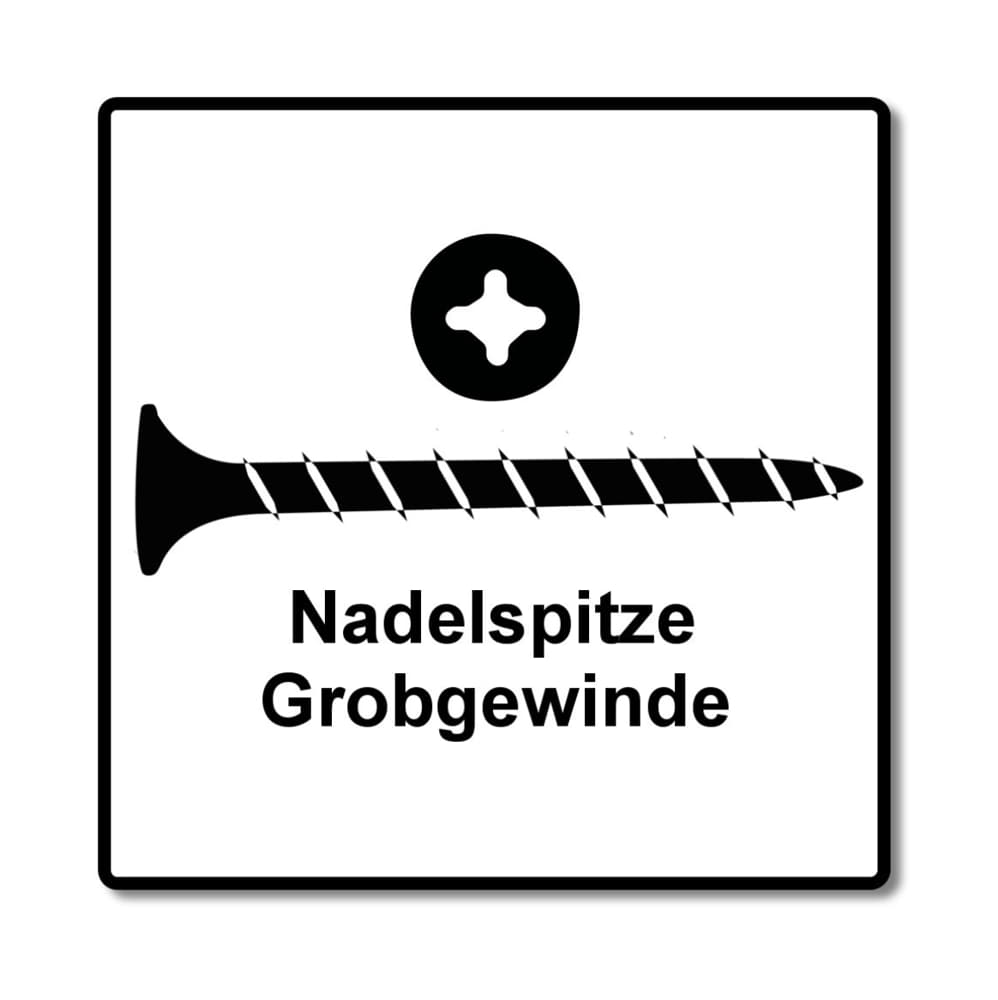 - 1x SPAX Schnellbauschrauben Grobgewinde magaziniert, 3,9x25 mm, 1000 Stück, Vollgewinde, Trompetenkopf, Kreuzschlitz H2, Nadelspitze, Phosphatiert schwarz ( 1891170390256 )