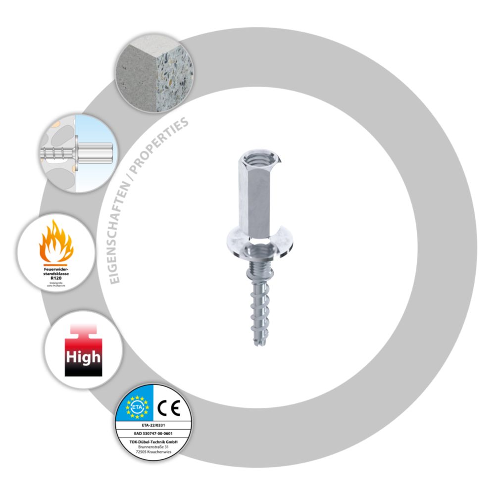 Die TOX Sumo Max 1 SK Schraubanker aus nichtrostendem Stahl A4 für schwere Lasten eignen sich ideal zum Befestigen von Geländern und Metallkonsolen im Außenbereich. Die TOX Sumo Max 1 SK Betonschrauben sind für verschiedene Klemmstärken zugelassen und in verschiedenen Größen erhältlich.