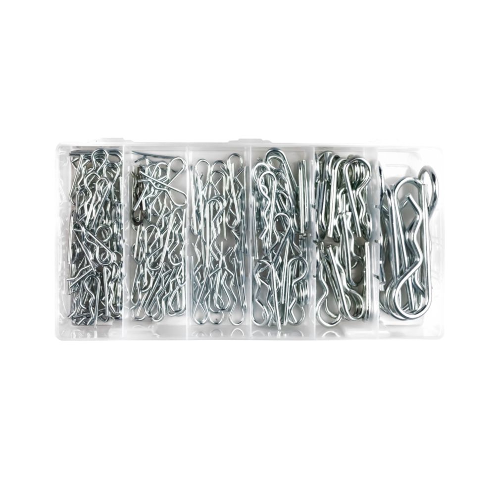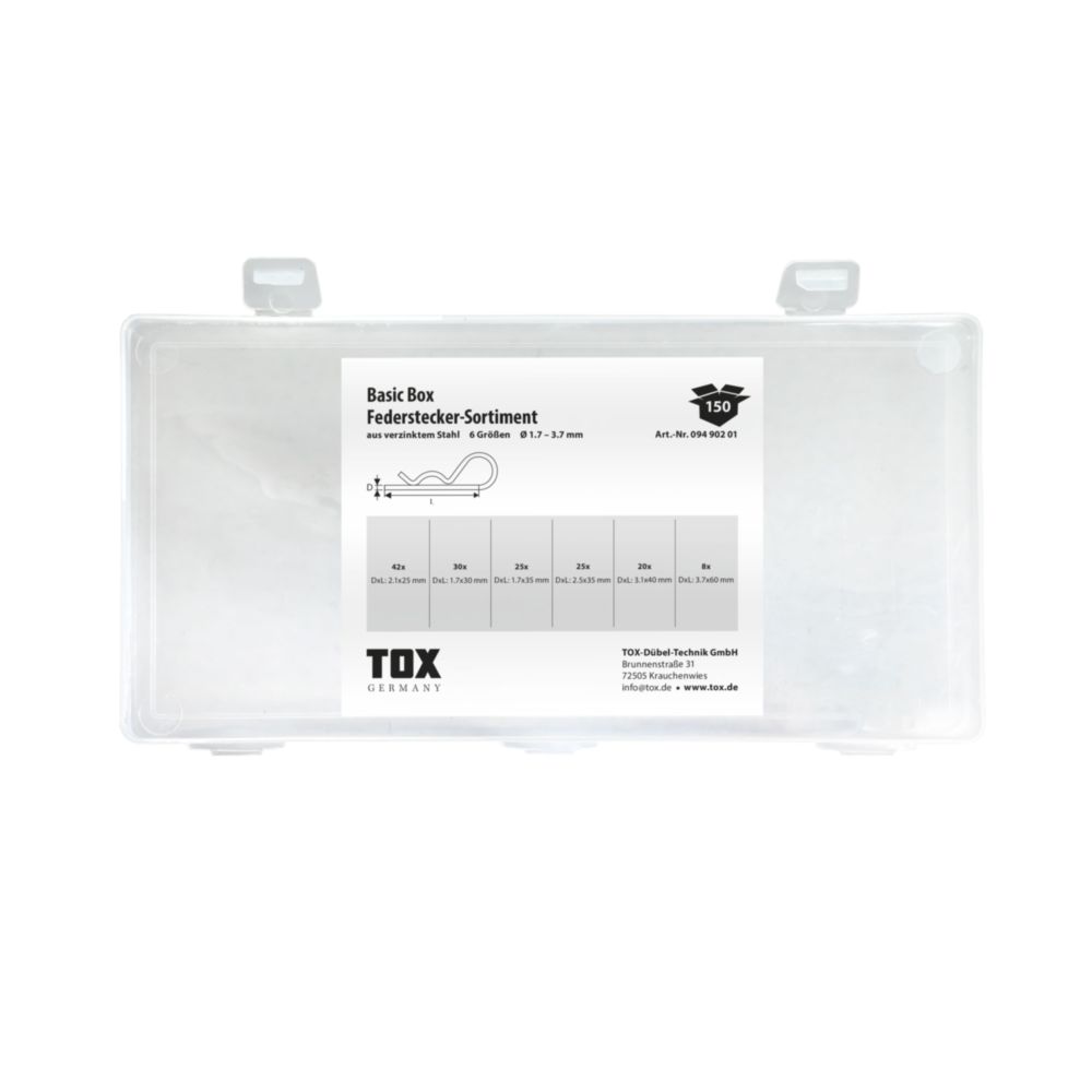 TOX Federstecker-Sortiment aus verzinktem Stahl, 6 verschiedene Größen in übersichtlicher Transportbox, ⌀ 1,7 - 3,7 mm, Länge 25 - 60 mm, einsetzbar in Fahrzeugen und Geräten, 150-tlg., 09490201