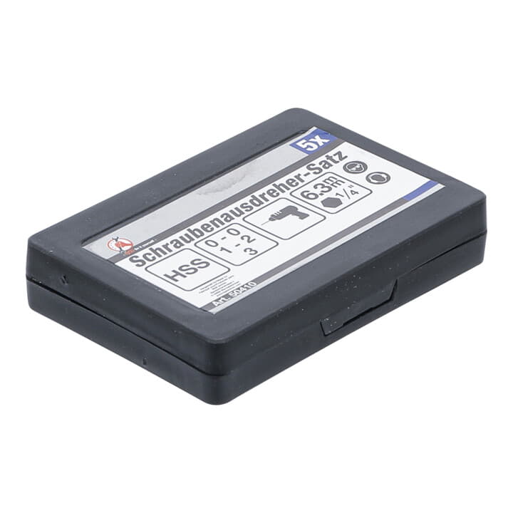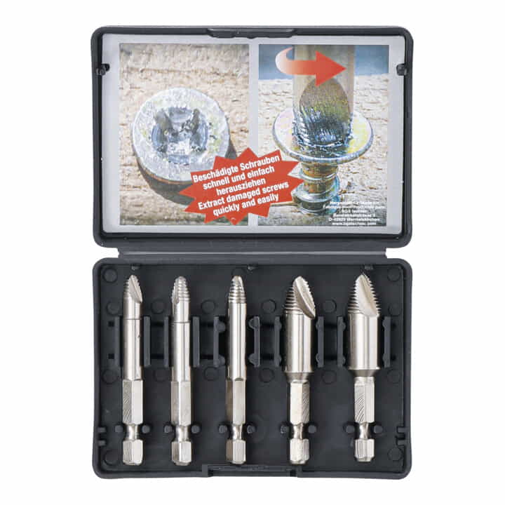 Lieferumfang: 1 x 5-teiliger Schraubenausdreher-Satz in transparenter Kunststoffbox, M3-M18, Chrom-Vanadium Stahl, 54 HRC, Nettogewicht: 117 g, 8551-55 / 6759620