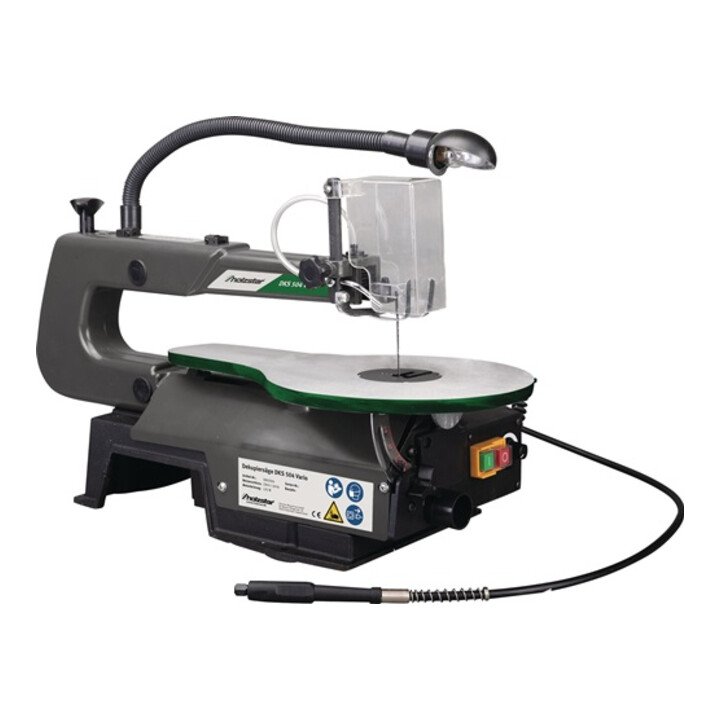 Dekupiersäge DECO FLEX SL Scheppach - 90W | 50Hz | 230-240V | Vario Drehzahl | LED Licht B-Ware Die scheppach DECO FLEX SL Dekupiersäge mit flexibler Welle ist die perfekte Wahl, wenn es um millimetergenaue Holzausschnitte, feine Konturen und sauberes Nacharbeiten für höchste Präzision geht. Das dünne Sägeblatt lässt sich präzise durch das Werkstück mit max. 50 mm Höhe manövrieren. Dank der Wendigkeit gelingen damit sogar feinteilige und runde Formen. Schnitthöhe/-tiefe: 50 / 405 mm Breiter Arbeitstisch aus Stahlblech, beidseitig neigbar um 45° Variable Hubzahl 550 – 1500 min-1 und 18 mm Hubhöhe Aufnahme von Stiftsägeblättern und Standard-Laubsägeblätter mit einer Sägeblattlänge von 127mm Schnellspannschraube zum einfachen Sägeblattwechsel Biegsame Welle mit Bohrfutter zum Schneiden, Schleifen und Polieren LED-Arbeitslampe zur Ausleuchtung des Arbeitsbereiches Werkstückniederhalter zum einfacheren Sägen von Ausschnitten Vibrationsarm für optimale und präzise Sägeergebnisse Gebläsedüse für eine freie Sicht auf den ArbeitsbereichFür präzise, anspruchsvolle und millimetergenaue Schnitte in Holz, aber auch in Kunststoff, Metall, Plexiglas oder Gips ist eine Dekupiersäge der perfekte Helfer. Mit dem dünnen Sägeblatt gelingen nicht nur besonders feine Konturen sowie ein sauberes Nacharbeiten, sondern dank der Wendigkeit auch feinteilige und runde Formen. Die scheppach DECO FLEX SL Dekupiersäge arbeitet mit einer variablen Drehzahl von 550 bis 1500Umdrehungen pro Minute besonders schnell. Die maximale Schnitthöhe beträgt 50 mm bei einer Tiefe von maximal 405 mm. Eine flexible LED-Arbeitslampe sorgt für einen stets optimal ausgeleuchteten Arbeitsbereich. Die Sägeblattaufnahme erlaubt ein Einspannen von Sägeblättern mit oder ohne Stift mit einer Sägeblattlänge von 127 mm. Auch das Verwenden eines Rundsägeblattes ist möglich. Ein Schnellspannsystem erleichtert das Auswechseln des Sägeblattes.Die zusätzliche biegsame, flexible Welle mit Bohrfutter für das professionelle Nacharbeiten der eigenen Schnittteile im Lieferumfang enthalten. Mit 1650 – 4500 min-1 und den passenden Aufsätzen werden Schnittkanten geglättet, Grate entfernt und Oberflächen poliert, selbst das Gravieren ist möglich, ohne ein weiteres Gerät anschaffen zu müssen.Durch ein Winkelmaß an der Tischunterseite kann die Tischneigung exakt eingestellt werden. Bis zu 45° Neigung ist möglich. Damit lassen sich nicht nur gerade und runde Schnitte in Holz, Kunststoff, Metall, Gips oder Plexiglas machen, sondern auch individuelle Winkel. Der Werkstückniederhalter sorgt auch bei Schräglage für eine einfachere und sichere Führung des Werkstückes.Bei geringerem Hub, also langsameren Schnitten, kann es vorkommen, dass die Sicht durch Späne behindert wird, die nicht komplett aus der Schnittfläche entfernt werden. Da kommt das Gebläse ins Spiel – über eine flexible Gebläsedüse hat man stets freie Sicht auf den Arbeitsbereich, da Späne und Staub sofort entfernt werden, sobald sie anfallen.