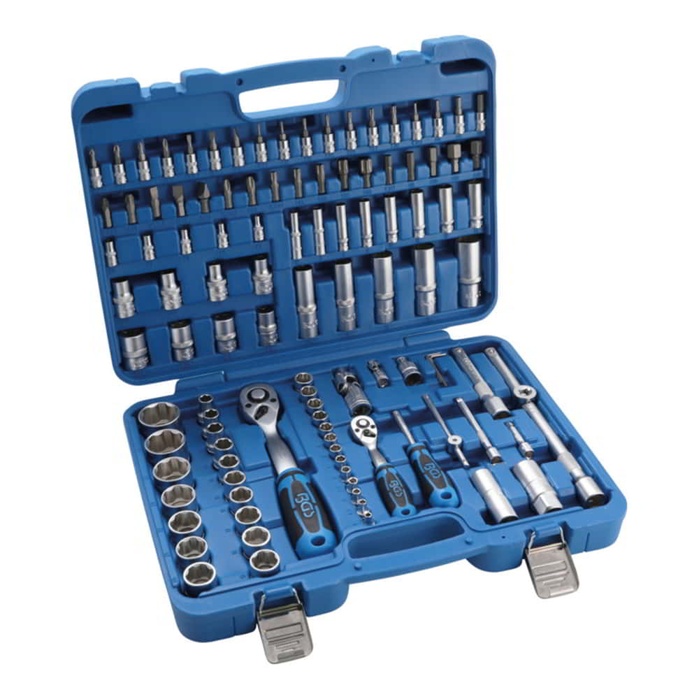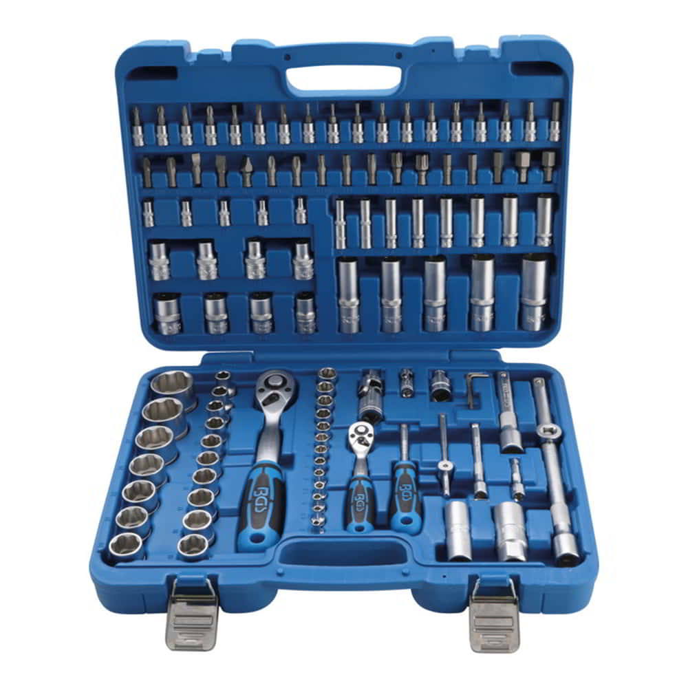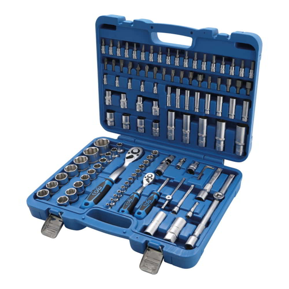 VARIABLE GRUNDAUSSTATTUNG: Der Koffer enthält Umschaltknarren 1/2inches + 1/4inches inkl. Verlängerung, Adapter, Kardangelenk, Schraubendreher, Hammer, Zange, Ringmaulschlüssel und sechskant Steckschlüssel.