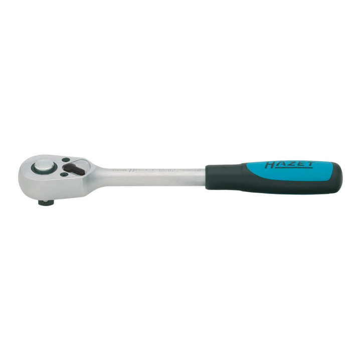 2K-Umschaltknarre 1/2inches: Nach DIN 3120 - A 12,5, ISO 1174, Rechts-/Linkslauf durch Hebel umschaltbar, Druckknopfauslösung, Feinverzahnt, ovaler Kopf, 2-Komponenten-Griff