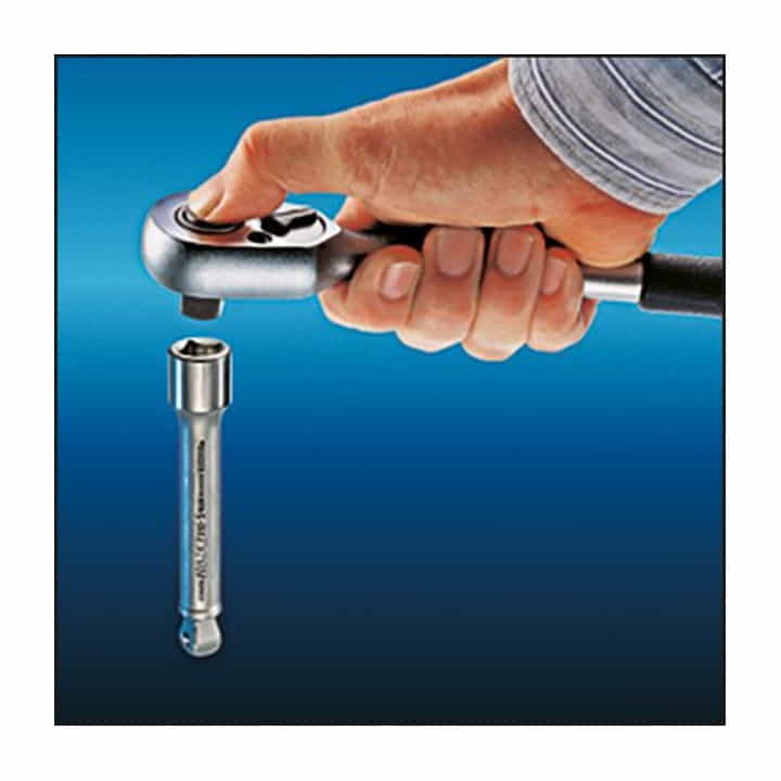 EINSATZ-SICHERUNG: Die Knarre mit umschaltbaren Hebel wird durch eine Kugelfangrille gesichert. Die Druckknopfauslösung macht den Wechsel der Einsätze oder Adapter besonders einfach.
