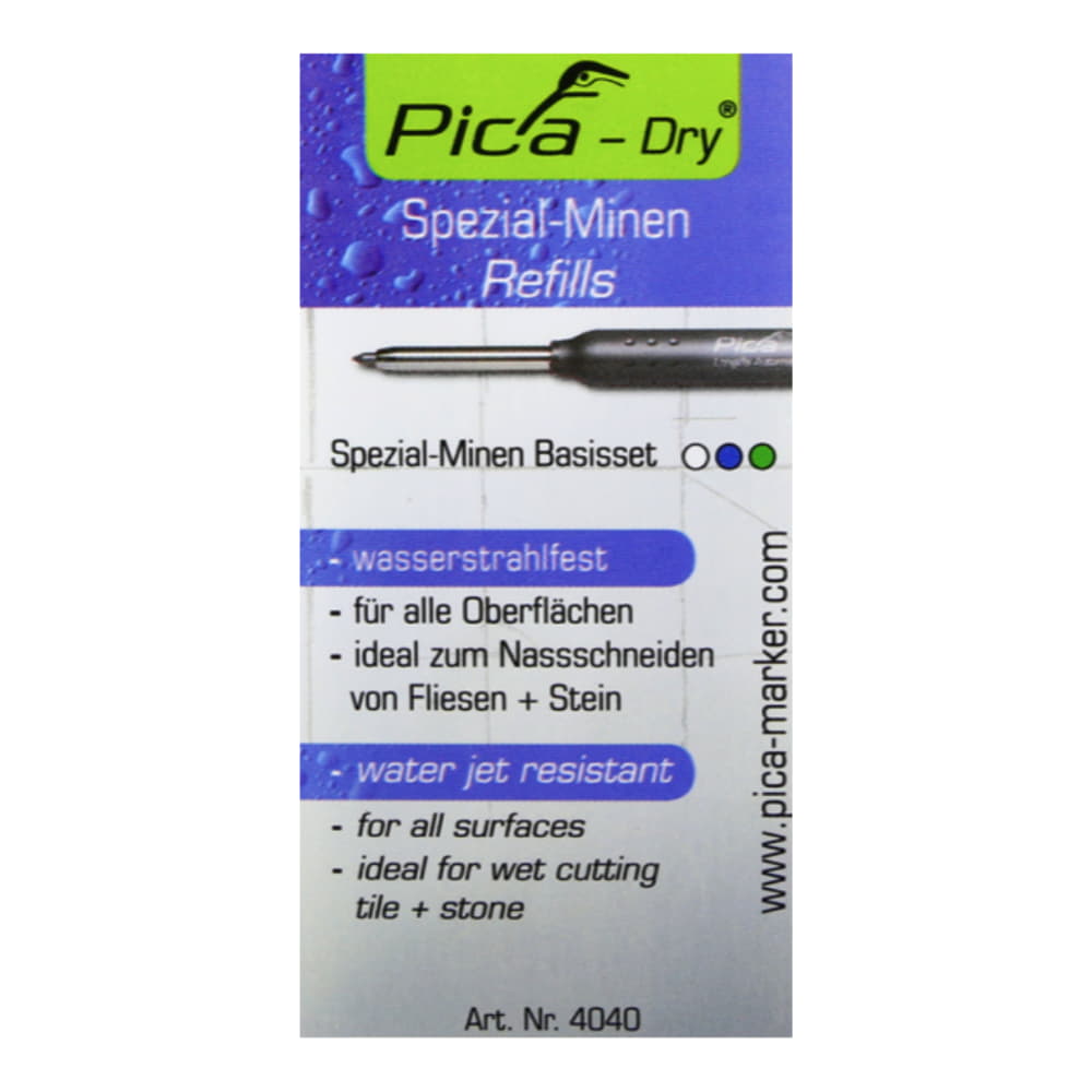Die Pica Dry Spezialminen sind für den Arbeitseinsatz auf fast allen Oberflächen geeignet, egal ob glatt oder rau, trocken oder feucht, staubig oder ölig. Die wasserstrahlfesten Minen eignen sich besonders zum Markieren beim Nassschneiden von Fliesen und Stein. Die Pica Dry Spezialminen sind Chlorid-frei.