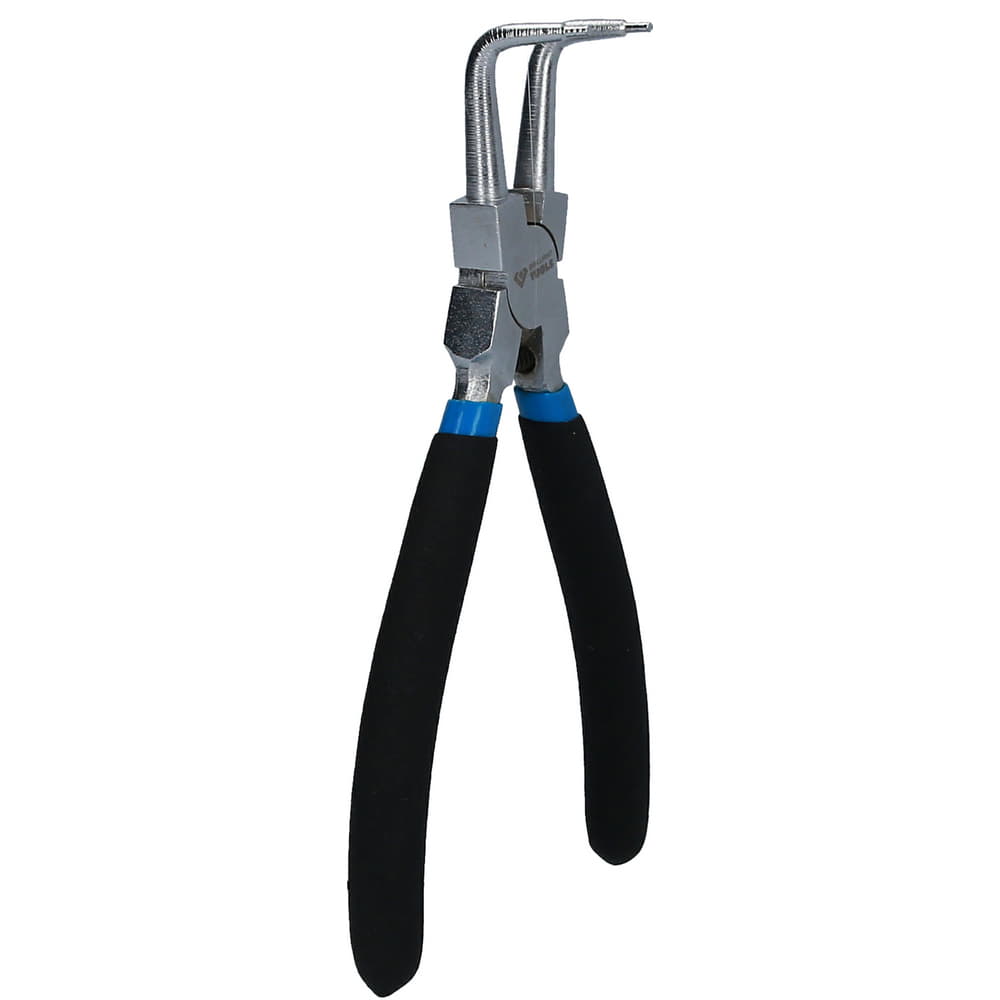 45° GEWINKELT: Die Montagezange für Innensicherungsringe verfügt über gewinkelte Backen. Die Zange ist daher optimal für den Ein- oder Ausbau einer Welle (Ø von 85-140 mm) bei wenig Platz geeignet.