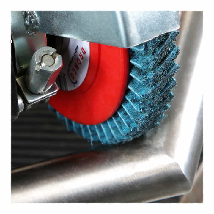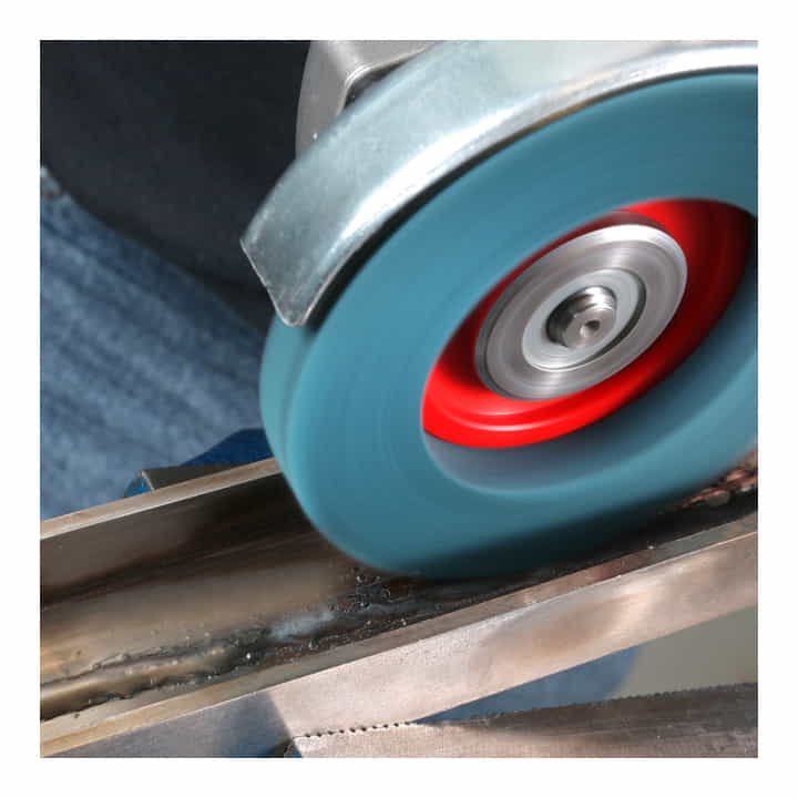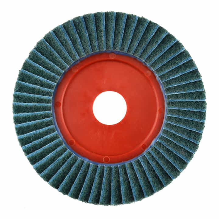 Polierrad mit aufrecht stehenden Lamellen aus hochwirksamem Schleifvlies auf verstärktem Kunststoffteller, mit einer Polierbelagdicke von 14 mm.