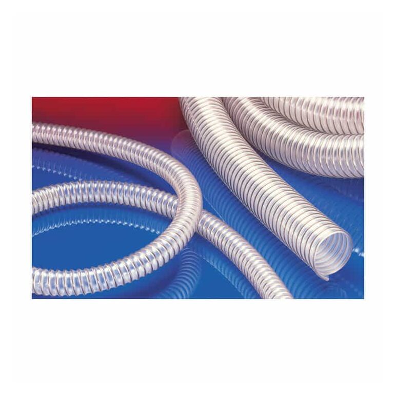 Abriebfester und antistatischer Absaug- und Förderschlauch; PUR <10⁹ Ω, schwer, innen glatt nKunststoffindustrie, Förderung von Granulaten und Pulver: Granulatfördergeräte, Vakuumförderer, Vakuumfördergeräte, Saugförderer, Dosiersysteme, Big-Bag Befüllung, Big-Bag Entleerung, Schredder, Mühlen, Extruder, Spritzgußmaschinen; Druckmaschinen, Luftversorgung: Luftversorgungsschränke, Offsetdruckmaschinen; Industriestaubsauger, Industriesauger, Staubsauger; Landwirtschaft, Förderung von Saatgut und Dünger: Drillmaschinen, Sämaschinen; Landwirtschaft: pneumatische Getreideförderer; Holzstaubabsaugung (DIN4102-B1): Holzstaub, Holzspäne, Holzindustrie, Möbelproduktion, Sägewerke; Holzstaubabsaugung (DIN4102-B1): Plattensägen, Sägen, Holzbearbeitungsmaschinen, Kantenberarbeitungsmaschinen, Parkettschleifmaschinen; Verdichter/ Kompressoren, Seitenkanalverdichter, Vakuumpumpen, Druckpumpen, Pumpen; Kugelstrahlmittel/ Sandstrahlmittel Rückführung z.B. an Strahlkabinen, Schiffswerften; Oberflächenbearbeitung: Kugelstrahlmittel/ Sandstrahlmittel Rückführung z.B. an Strippern, Boden-Fräsen, Schleifmaschinen; Kommunalfahrzeuge: Kehrmaschinen, Kleinkehrmaschinen, Großkehrmaschinen; Kommunalfahrzeuge: Grasmähgeräte, Rasenmäher, Böschungsmäher, Laubsauger/ LaubsammlerEigenschaften: Wandung permanent antistatisch (ableitfähig gemäß TRBS 2153) <10⁹ Ω, empfohlen zur Förderung brennbarer Schüttgüter; erfüllt die Sicherheitsauflagen der deutschen Holz-BG; hoch abriebfest; strömungstechnisch optimiert; erhöhte Druck- und Vakuumfestigkeit; mikrobenfest; gute Öl-, Benzin- und Chemikalienbeständigkeit; schwerentflammbar nach: UL94-V2; schwerentflammbar nach: DIN 4102-B1; gemäß TRBS 2153 (ehemals BGR 132) kann die Spirale geerdet werden; DIN 4102-B1 gilt ab Innendurchmesser 60mm nTemperaturbereich: -40°C bis 90°C; kurzzeitig bis 125°C n nKonstruktion, Werkstoff: AIRDUC® Profilschlauch; in der Wandung fest eingegossener Federstahldraht; Wandung: permanent-antistatisches Premium Ester-Polyurethan (Pre-PUR®); Wandstärke ca. 1,5 mm
