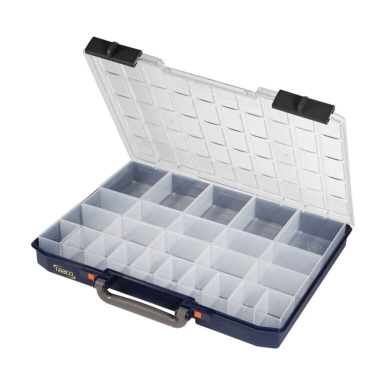 - Aus schlagfestem Polypropylen · kein Verbeulen · kein Rosten · keine scharfen Kanten und Ecken · der Deckel aus unzerbrechlichem Polycarbonat hat ein Raster auf der Innenseite, das das Verrutschen kleinster Teile verhindert · mit ergonomischem Tragegriff