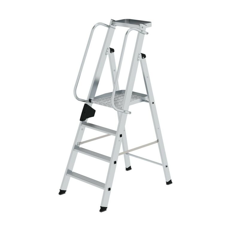 80 mm tiefe, geriffelte Stufen Dauerhafte Stufen-Holmverbindung Rutschsichere nivello®-Leiterschuhe und ergo-pad® Griffzone Große Standplattform ca 400 x 400 mm Klappbare Ablageschale oben ca 350 x 200 mm Optimiertes Leitern-Gelenk 'safe-cap' mit größerer Anlagefläche, 6-fach Vernietung und höherer Wandstärke für noch mehr Stabilität und Langlebigkeit der Leiter 2 Handläufe ca 750 mm lang, zum Selbstanbau (ab Bestell-Nr. 50088, 1300 mm lang) Spreizsicherung mit 2 hochfesten Perlongurten Hohe Standsicherheit durch konische Bauweise