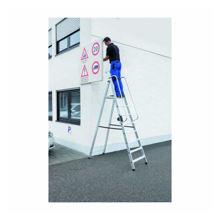 80 mm tiefe, geriffelte Stufen Dauerhafte Stufen-Holmverbindung Rutschsichere nivello®-Leiterschuhe und ergo-pad® Griffzone Große Standplattform ca 400 x 400 mm Klappbare Ablageschale oben ca 350 x 200 mm Optimiertes Leitern-Gelenk 'safe-cap' mit größerer Anlagefläche, 6-fach Vernietung und höherer Wandstärke für noch mehr Stabilität und Langlebigkeit der Leiter 2 Handläufe ca 750 mm lang, zum Selbstanbau (ab Bestell-Nr. 50088, 1300 mm lang) Spreizsicherung mit 2 hochfesten Perlongurten Hohe Standsicherheit durch konische Bauweise