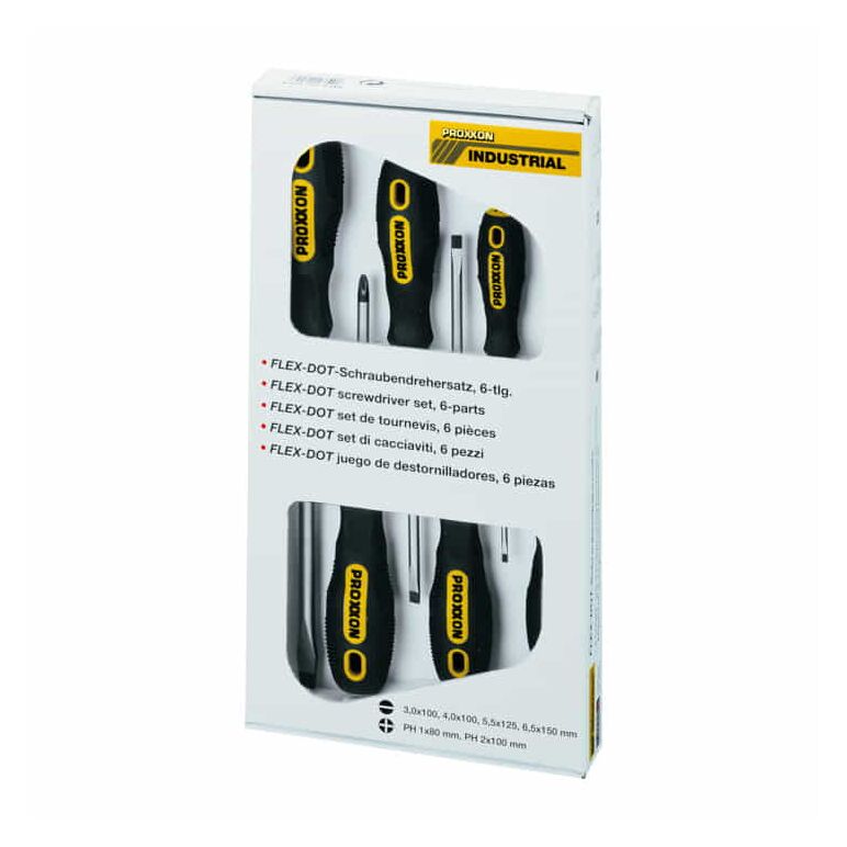 - Der PROXXON FLEX-DOT-Schraubendrehersatz mit Schlitz- und PHILLIPS-Kreuzschlitz-Schraubendrehern ist eine Zusammenstellung, die in keiner Werkzeugkiste fehlen sollte.