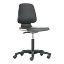 nach DIN 68877 · bedienungsfreundliche Gasfeder-Sitzhöhenverstellung · ergonomisch geformter Sitz und Rückenlehne · Sitz mit Polster aus Supertec-Gewebe, extrem strapazierfähig widersteht mechanischen Einflüssen · atmungsaktiv, komfortabel, weich und abwaschbar · Rückenlehne mit 3D-Flexfunktion passt sich den Bewegungen des Nutzers an · Fünffuß-Untergestell aus Kunststoff, flach auslaufend, kipp- und stolpersicher · Untergestell mit lastabhängig gebremsten Sicherheits-Doppelrollen für harte Böden