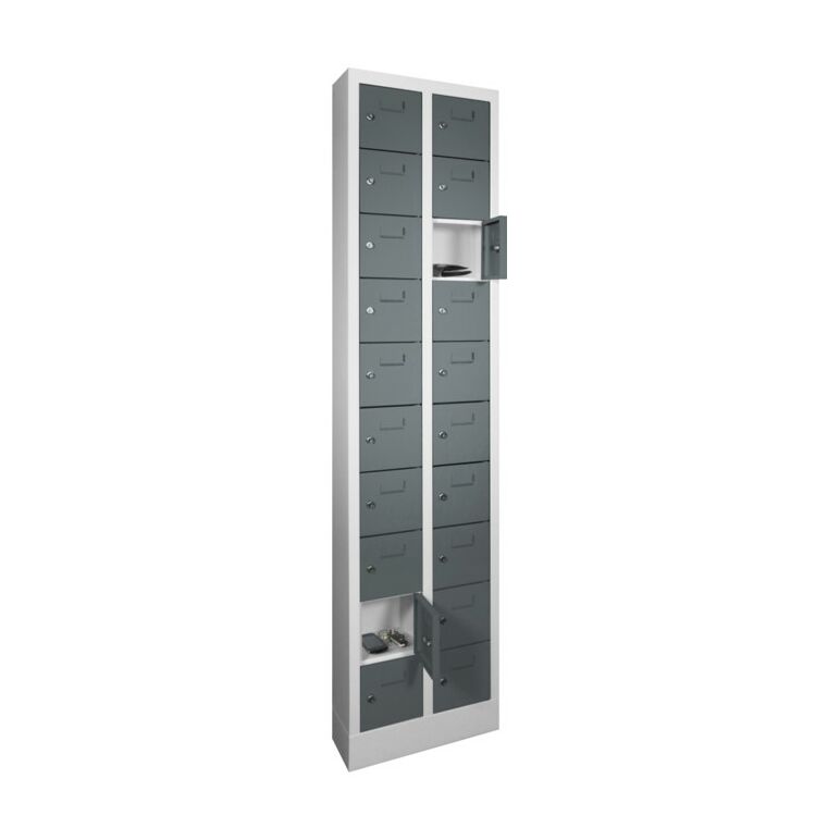 Kleinfachschrank, BxTxH 460x200x1950 mm, 2x10 Fächer, Fachbreite 145 mm, Schloss, Sockel, RAL 7035/7016 lichtgrau/anthrazit