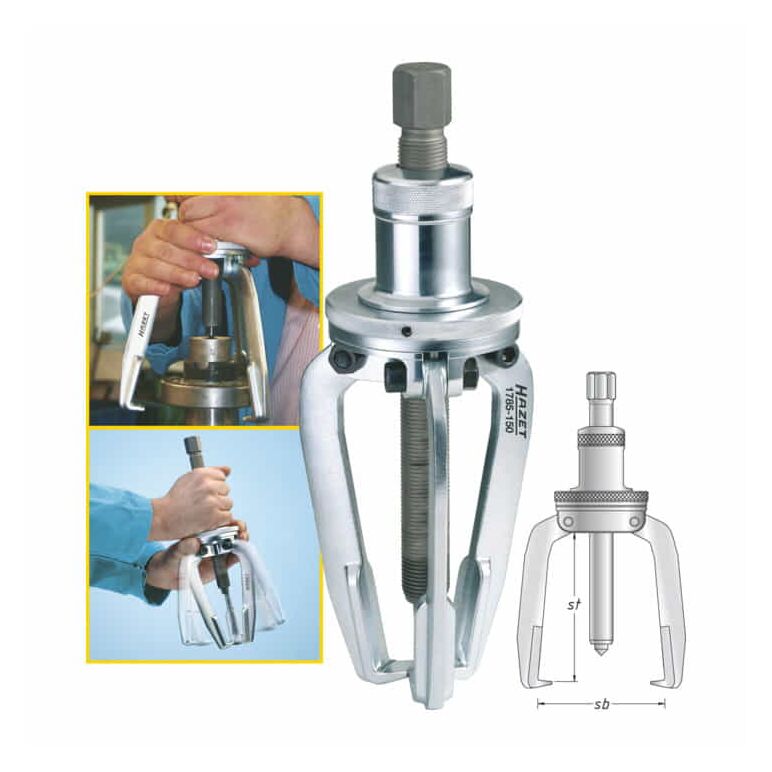 - Einfache Drehbewegung öffnet Haken und umschließt automatisch abzuziehendes Teil auch bei senkrechter Anwendung (Nachjustieren entfällt)