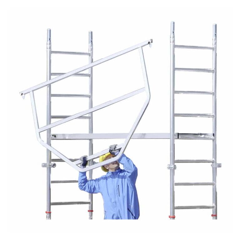 Fahrgerüst mit innovativem Aufbaukonzept · Gesicherter Stand in jeder Phase des Auf- und Abbaus · Geschweißte Rahmenteile sind robust und verbessern die Statik des Gerüstes, wodurch größere Aufbauhöhen erreichbar sind · Mit höhenverstellbaren, spindelbaren Lenkrollen, dadurch auch für unebene Flächen z. B. im Außenbereich geeignet · Zulässige Belastung: 200 kg/m² (2,0 kN/m²), gemäß Gerüstgruppe 3