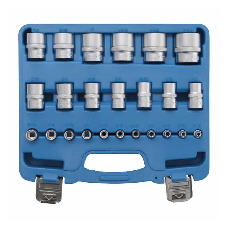 • Steckschlüssel-Einsätze Sechskant, Antrieb Innenvierkant 12,5 mm (1/2"): SW 1/2" - 9/16" - 19/32" - 5/8" - 11/16" - 3/4" - 13/16" - 7/8" - 15/16" - 1" - 1.1/16" - 1.1/8" - 1.1/4"