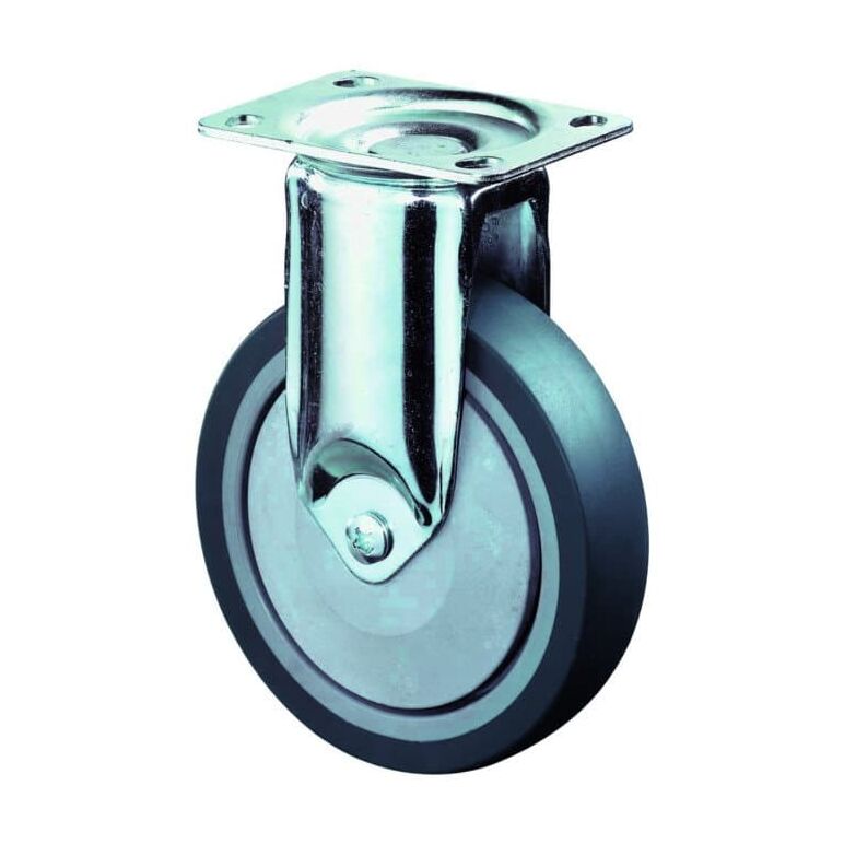 schwere Apparaterolle · Gehäuse aus Stahlblech, verzinkt-chromatiert · korrosionsunempfindlich · thermoplastische Gummibereifung (grau) · Kugellager · mit Plattenbefestigung Rad-Ø 80 und 150 mm = mit Metall-Fadenschutz Rad-Ø 100 und 125 mm = mit Kunststoff-Fadenschutz Weitere technische Eigenschaften: · Oberfläche Gehäuse: verzinkt-chromatiert · Befestigungsart: mit Anschraubplatte · Bauhöhe: 115mm · Arbeitstemperatur: -10 - 60°C · Material Gehäuse: Stahlblech · Plattenlänge: 94mm