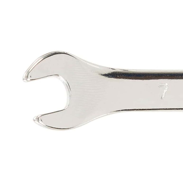 Hochglanzpolierter Ring-Maulschlüssel mit schmalem Profil. Gesenkgeschmiedeter, vergüteter Chrom-Vanadium-Stahl.