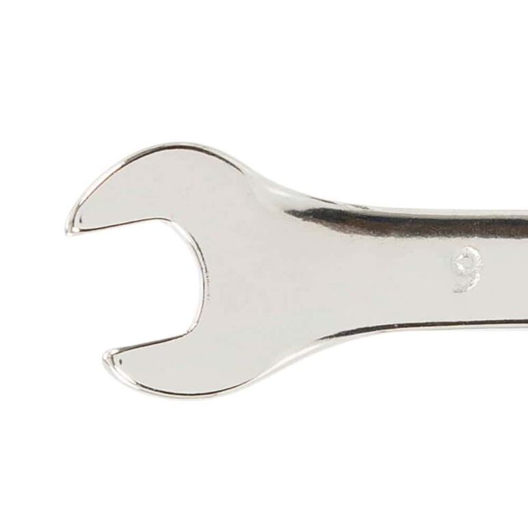 Hochglanzpolierter Ring-Maulschlüssel mit schmalem Profil. Gesenkgeschmiedeter, vergüteter Chrom-Vanadium-Stahl.