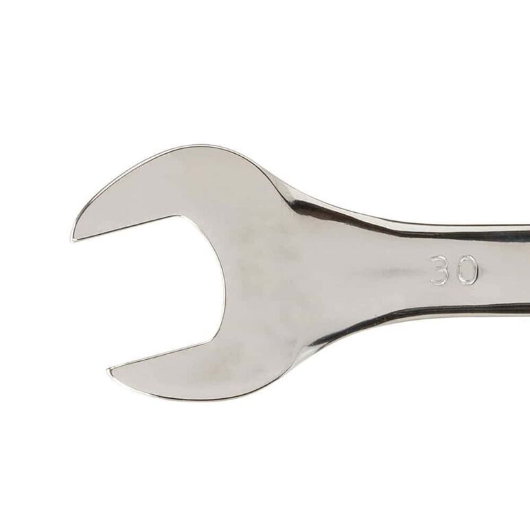 Hochglanzpolierter Ring-Maulschlüssel mit schmalem Profil. Gesenkgeschmiedeter, vergüteter Chrom-Vanadium-Stahl.