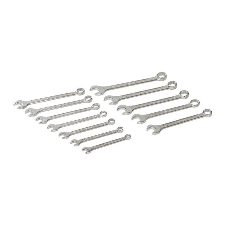 Schlüsselköpfe zum Ansetzen bei beengtem Arbeitsraum um 15° abgewinkelt. Vergüteter, gesenkgeschmiedeter Chrom-Vanadium-Stahl. Satinierte Griffflächen und hochglanzpolierte Schlüsselköpfe. Ständer im Lieferumfang enthalten. Größen: 8, 9, 10, 11, 12, 13, 14, 15, 16, 17, 18 und 19 mm.