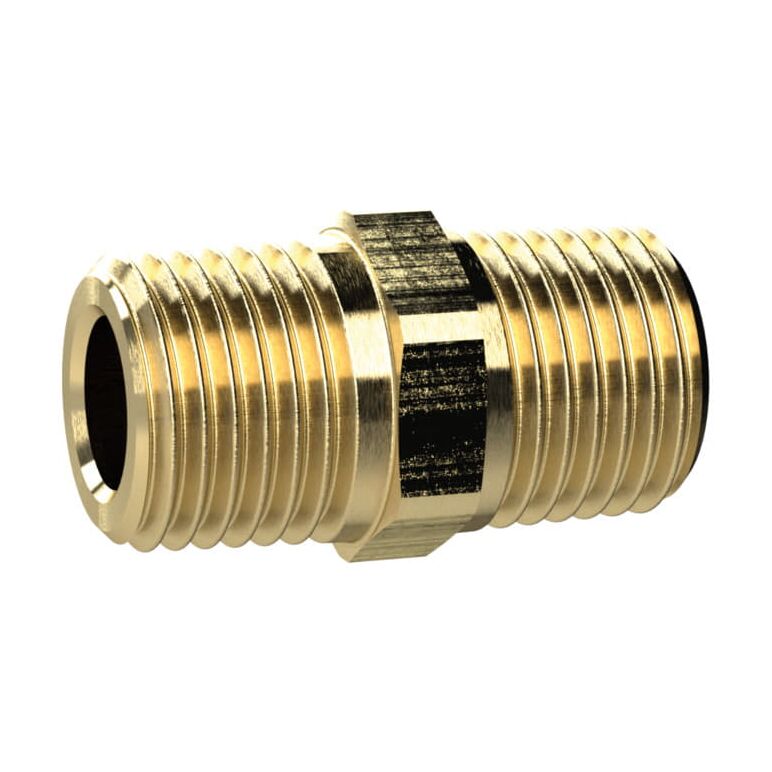 • Doppelgewindenippel, R 3/8 a., R 1/2 a., SW 22, Messing, Arbeitsdruck max. 25 bar, Betriebstemperatur max. 150 °C